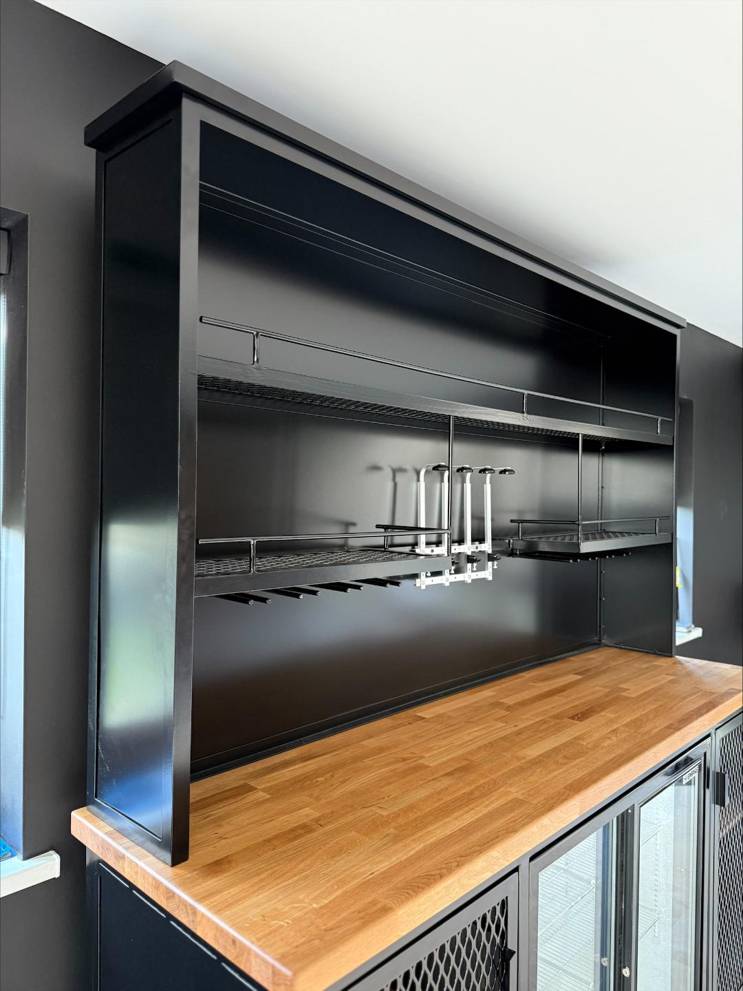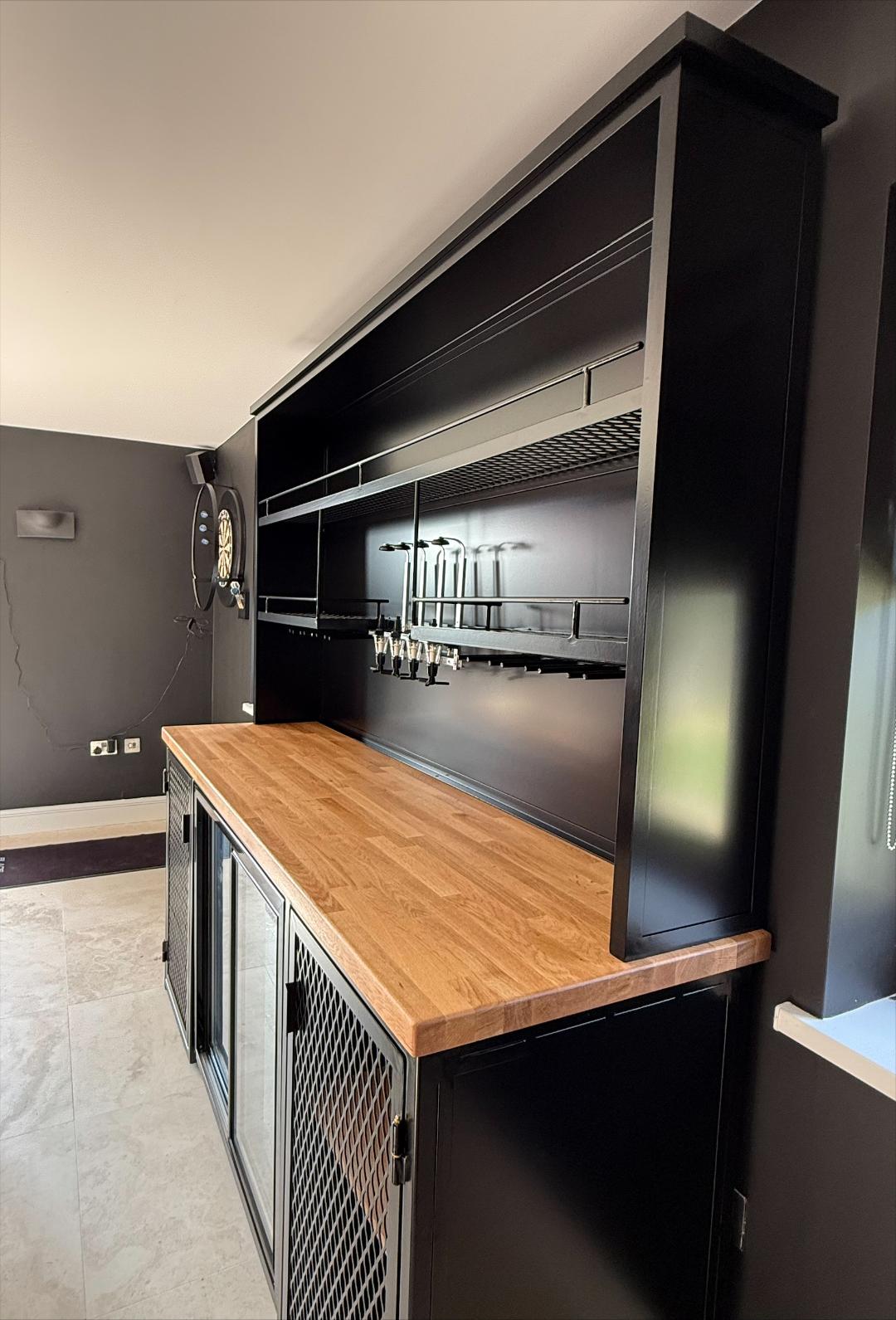 Double drinks fridge, Wine glass holders to the right for up to 8 glasses, 4 bottle optics, Solid butchers block oak top, 2 storage cupboards, and loads of shelving space for all those favourite tipples.